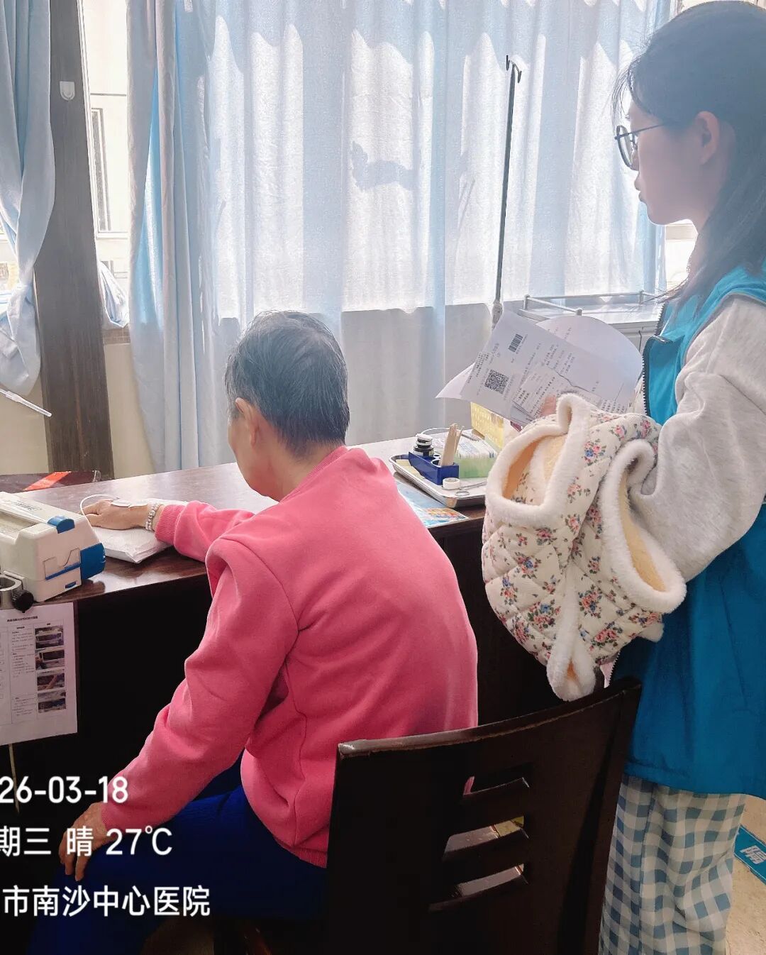 到达医院后,帮扶小组协助老人办理挂号、就诊、检查等全流程手续,全程陪护完成诊治。经医生诊断,老人确诊为肠梗阻并立即接受输液治疗。治疗期间,帮扶小组始终守在老人身边密切关注身体状况,实时向家属反馈治疗进展,让远方的家属安心放心。